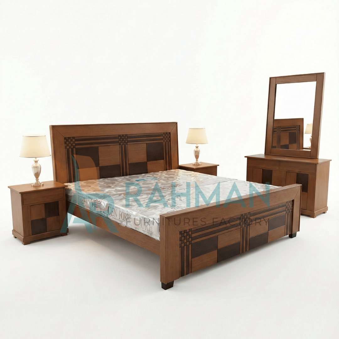 Introduce timeless simplicity to your bedroom with the 8 Dabi Bed Set. True to its name, this design features a distinctive geometric “8-box” pattern on the headboard and footboard, creating a clean and structured look. Crafted with high-quality wood and finished in a warm walnut tone, the contrasting dark and light wood grain squares add depth and character. This set strikes the perfect balance between traditional durability and modern minimalist design.