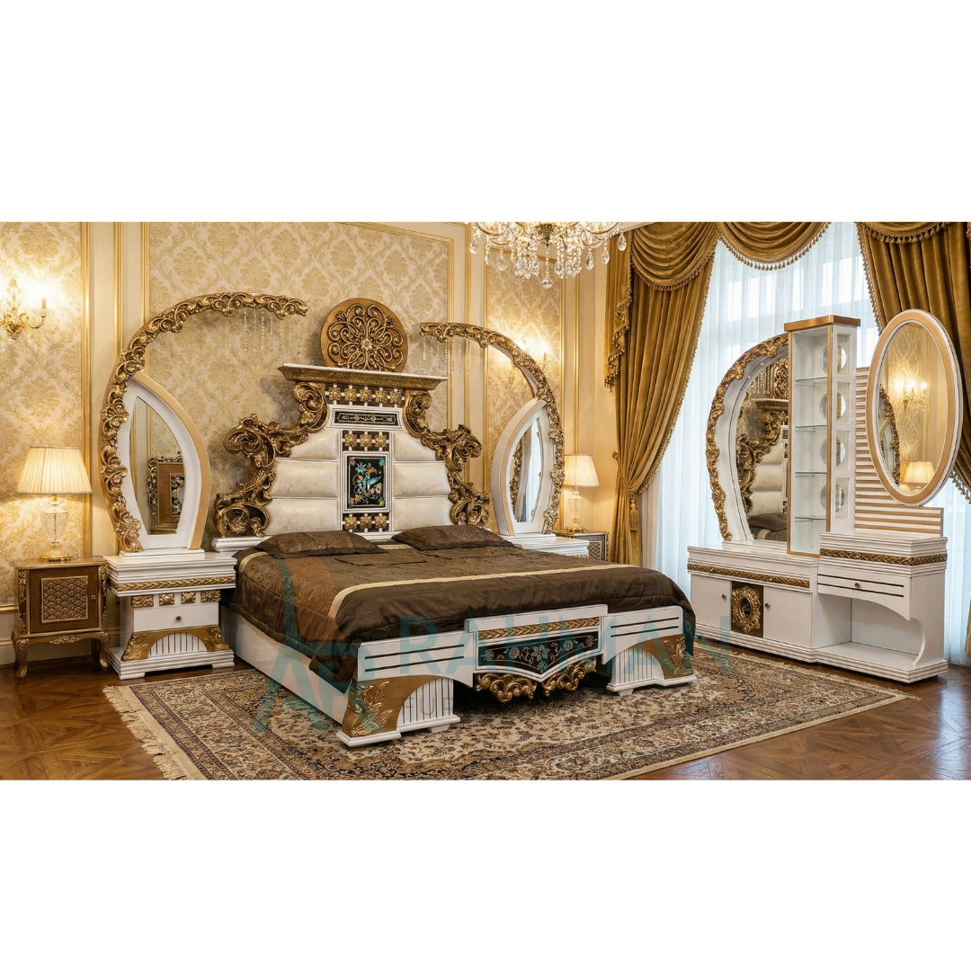 Yeh bed set kisi mehal (palace) ke furniture se kam nahi lagta. Iska sab se barra feature iskay Golden Arches (barri mehraab) hain jo headboard ke dono taraf phaily hui hain. White Deco Paint aur Antique Gold ka combination isay bohot shandaar banata hai. Iska dressing table bhi bohot unique hai jis mein aik Glass Showcase (cabinet) bhi attached hai.