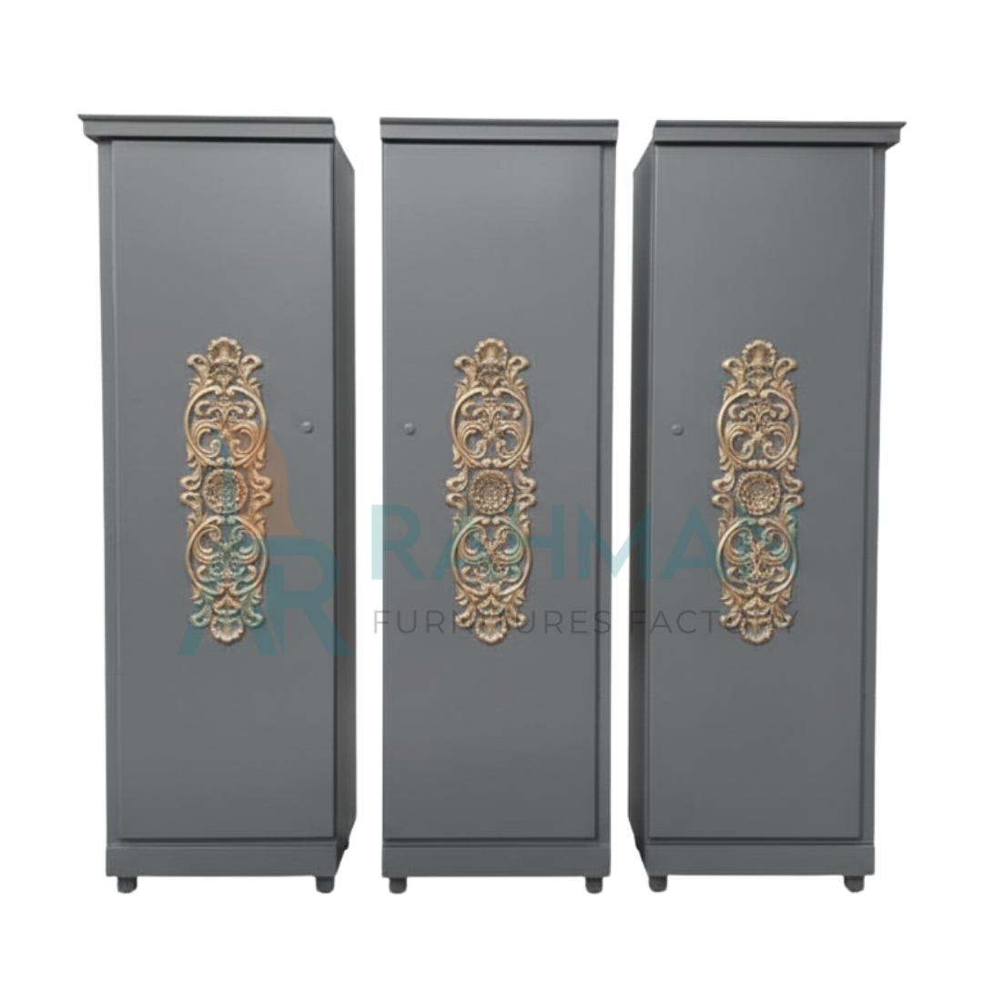 Add a touch of understated luxury to your room with the Royal Slate Grey Wardrobe. Finished in a smooth matte slate-grey deco paint, this almari features a stunning vertical antique gold floral carving on the center of each door. The intricate baroque-style motif provides a rich contrast against the minimal grey background, creating a sophisticated Neoclassical look. Perfect for those who want a break from traditional black or brown furniture.