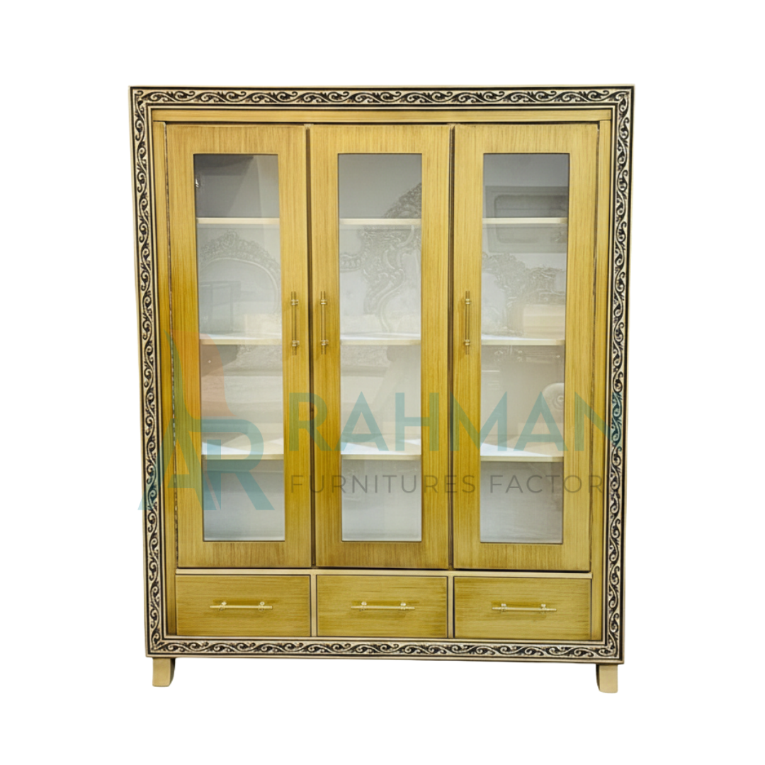 Brighten up your room with the Royal Golden Oak Showcase. This vibrant display cabinet is finished in a light golden-yellow oak texture that adds warmth and energy to any space. The design is framed by a striking black border featuring intricate floral scrollwork, creating a bold and artistic look. With three large glass doors for displaying your crockery and three spacious drawers at the bottom for utility storage, this unit is both eye-catching and functional.